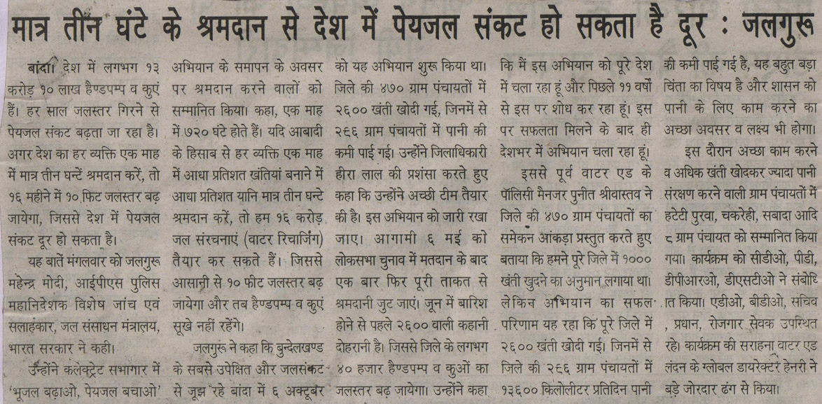 मात्र तीन घंटे के श्रमदान से देश में पेयजल संकट हो सकता है दूर: जलगुरुअपना शहर, 27 मार्च 2019