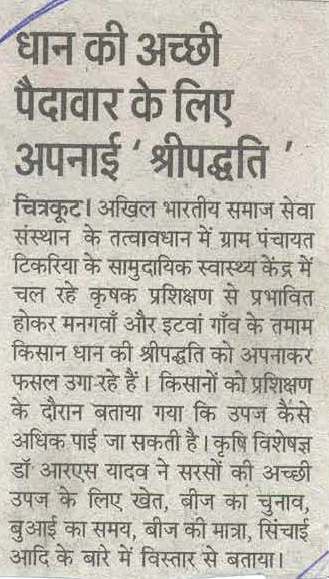 अखिल भारतीय समाज सेवा संस्थान के तत्वाधान में ग्राम पंचायत टिकरिया के सामुदायिक स्वास्थ्य केन्द्र में चल रहे कृषक प्रशिक्षण से प्रभावित होकर मनगवां और इटवां गावं के तमाम किसान धान की श्रीपध्दति को अपना कर फसल उगा रहे हैं। किसानों को प्रशिक्षण के दौरान बताया गया कि उपज कैसे अधिक पाई जा सकती है। कृषि विशेषज्ञ आर एस यादव ने सरसों की अच्छी उपज के लिए खेत, बीज, का चुनाव, बुआई का समय, बीज की मात्रा, सिंचाई आदि के बारे में विस्तार से बताया।